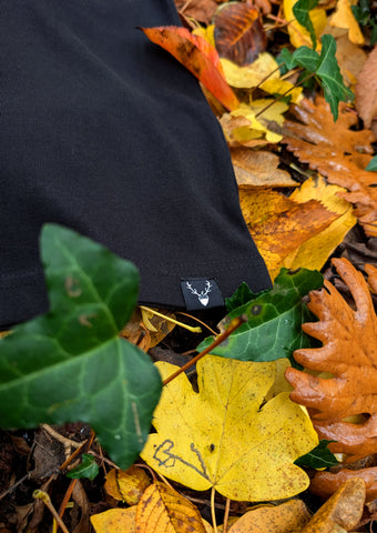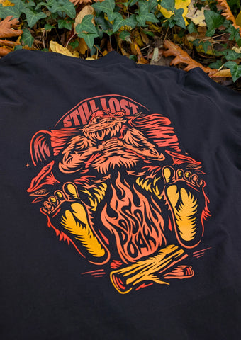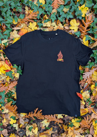 Printed on organic heavyweight cotton, this black t-shirt has a relaxed fit and warm screen printed fireside colours.